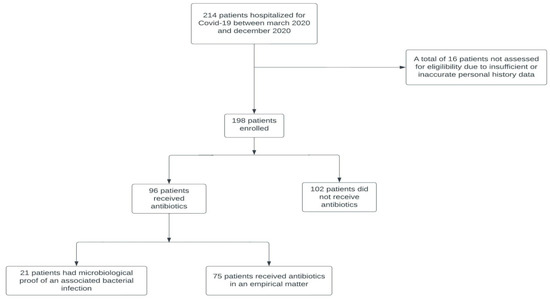 Forty-four (22.22%) out of the 198 patients received antibiotics at home prior to the admission, while 96 (48.48%) of the patients were first administered one or more antibiotic classes during the hospitalization. Out of the patients who were prescribed antibiotics, 2 (2.1%) developed a mild disease, 41 (42.7%) had a moderate disease and 53 (55.2%) a severe form of the disease. The prescribed antibiotic classes during hospitalization were: beta-lactams (penicillins, cephalosporins, carbapenems, beta-lactams inhibitors), glycopeptides (vancomycin), tetracyclins (doxycycline, tygecycline), oxazolidonones (linezolid), macrolides (clarithromycin, azithromycin), and fluoroquinolones (Ciprofloxacin, Levofloxacin, Moxifloxacin). Because of the heterogeneous data that resulted from simultaneous or successive antibiotic regimens, it is very difficult to determine the exact percentage of each prescribed antibiotic class. Twenty-one (10.61%) patients underwent antimicrobial therapy guided by the evidence of a bacterial infection (positive blood, urine or sputum culture or Clostridioides difficile stool test). The following bacteria species were isolated: Klebsiella spp. (4 cases), Staphylococcus aureus (1 case), MDR E. coli (2 cases), Clostridioides difficile (14 cases). The other 75 received antibiotics in an empirical manner (based on increasing procalcitonin levels, inflammatory biomarkers, and clinical judgement).