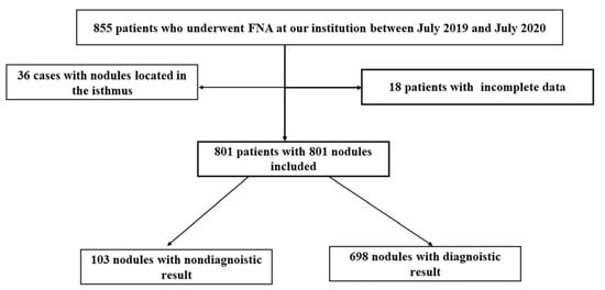 We retrospectively analyzed patients who underwent FNA at our institution between July 2019 and July 2020. The included patients met the following criteria: (1) initial ultrasound-guided FNA, (2) no history of thyroid ablation before FNA, (3) FNA specimen evaluation and adequate medical records available, and (4) targeted nodules located in bilateral lobes. Exclusion criteria were (1) cystic or mixed cystic nodules and (2) nodules located in the isthmus. The final analysis included 801 thyroid nodules from 801 patients (Figure 1).