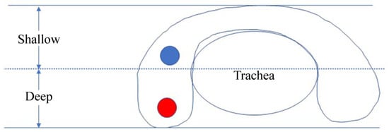Sketch of shallow and deep nodules. A line is drawn at the midpoint of the distance between the highest and lowest points of the thyroid gland on a cross-section. Any nodule above this line is defined as a shallow nodule, and all others are defined as deep nodules.