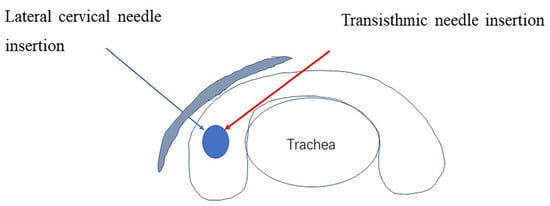 The FNA procedure was established according to expert consensus and Chinese guidelines []. FNAs were performed by interventional ultrasound physicians. A 25 G needle (Hakko, Chikuma, Japan) was used under ultrasound guidance, and three or four passes were performed for each nodule according to the guidelines. Each pass included 6–7 to-and-from needle movements over 5–10 s per nodule. Using a freehand parallel approach, aspirations were conducted at different angles and within different nodule regions to obtain representative samples. Needle insertion was directed either transisthmic or lateral cervical (Figure 3).