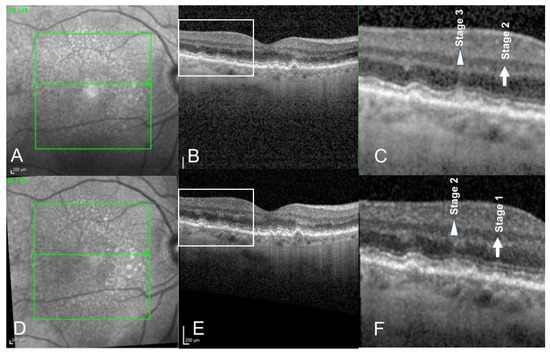 Spectral Domain Optical Coherence Tomography (SD-OCT) scans of a 76-year-old female patient presenting with reticular pseudodrusen, before (A–C) and 6 months after photobiomodulation treatment (D–F). Infrared imaging (A,D). SD-OCT scan showing redicular pseudodrusen before (B) and after (E) treatment. We can observe that a stage 3 reticular pseudodrusen (triangle, (C)) regressed into a stage 2 (triangle, (F)) reticular pseudodrusen 6 months after treatment. Similarly, a stage 2 reticular pseudodrusen (arrow (C)) regressed into a stage 1 reticular pseudodrusen (arrow, (F)) 6 months after photobiomodulation treatment.
