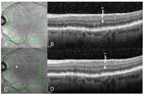 Spectral Domain Optical Coherence Tomography (SD-OCT) scans of a 76-year-old male patient before (A,B) and 6 months after photobiomodulation treatment (C,D). We can observe that a stage 3 reticular pseudodrusen (arrow, (B)) regressed into a stage 1 reticular pseudodrusen (arrow, (D)) after photobiomodulation treatment.