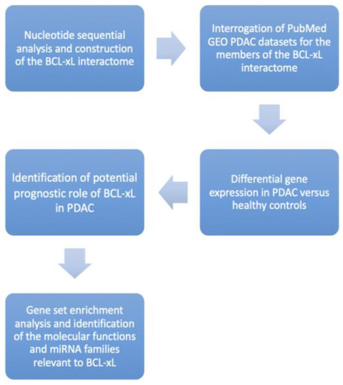 In this context, it has been documented that certain cancer activities, such as cell development, growth, invasion, and metastasis, highly depend on the metabolism rate along with the tumor microenvironment [7]. The BCL-2 protein family is characterized by their implication during the process of apoptosis [6]. BAK and BAX represent the two primary members of the family with pro-apoptotic attributes, which are essential during the execution phase of the apoptotic pathways [6,7], while there are other genes, like BCL-xL (gene/transcript name: BCL2L1), BCL2, BCL2A1, MCL1, and BCL-W, that are mainly associated with anti-apoptotic properties that promote the survival of the cells [8]. In fact, the distribution between the pro-apoptotic and anti-apoptotic members finally contributes to the death or survival of a cell. At present, the role of this BCL-2 family of proteins in PDAC is poorly understood. Despite the importance of BCL-xL in cell survival, the available evidence regarding its distorted expression/function in the context of PDAC is limited [9]. This information prompted us to perform a bioinformatic analysis regarding the role of BCL-xL in PDAC.