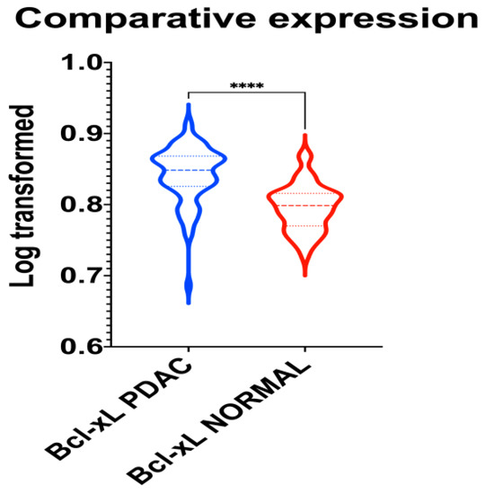 A unique PubMed GEO PDAC microarray dataset was identified (GSE62452), which included a total of 130 samples (PDAC: 69; adjacent non-tumor tissue control: 61), with a substantial level of agreement between the reviewers (Kappa = 0.651; 95% CI: 0.006, 1.000). According to our outcomes, BCL-xL is upregulated in PDAC (p < 0.001), as highlighted in Figure 4.