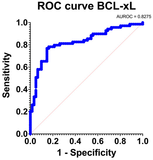 BCL-xL provided an excellent discrimination level (AUC: 0.83 [95% Confidence Intervals: 0.76, 0.90]; p < 0.001). The ROC curve is depicted in Figure 5. BCL-xL also provided an adequate estimation of the PDAC incidence (O: E = 1). Furthermore, the goodness of fit test was positive and the Tjur’s R squared test was low (R squared = 0.31). Consequently, BCL-xL provided excellent discrimination and calibration traits.