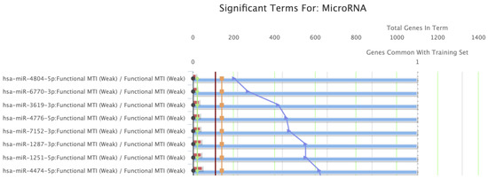 BCL-xL underwent GSEA (Figure 6). The five most significantly enriched GO terms for molecular functions are presented in Table 2, along with the regulating miRNAs. Regulation of BH, BH3, and MDM2/MDM4 family protein binding activities, along with cysteine-type endopeptidase inhibitor activity involved in apoptotic processes, represented the most significant molecular functions relevant to BCL-xL. Finally, the GSEA proposed that the members of the hsa-miR-4804-5p, hsa-miR-6770-3p, hsa-miR-3619-3p, hsa-miR-4776-5p, and hsa-miR-7152-3p families play a significant role in the regulation of BCL-xL-associated pathways.