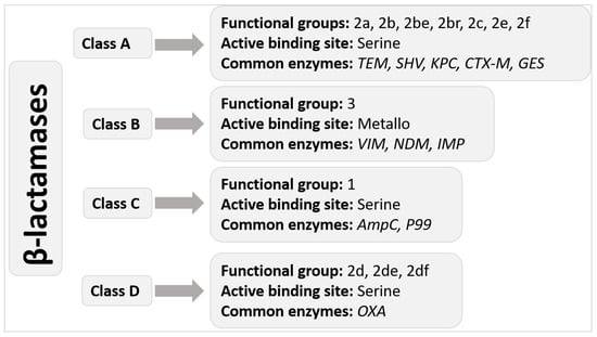 Carbapenem is an antibiotic against severe bacterial infections, although often reserved for MDR bacterial infections. It is a β lactam antibiotic that works like penicillin and cephalosporins, which belong to the same class. Carbapenem exerts its antibiotic effects by inhibiting transpeptidases, thereby inhibiting peptidoglycan synthesis. Inhibition of peptidoglycan synthesis in the Gram-negative bacteria causes the cells to undergo lysis []. The Gram-negative CRE has developed resistance to the carbapenems. The resistance offered by CREs against Carbapenem is usually caused by either hydrolysis of the antibiotic by carbapenemase they produce or structural mutations that induce expression of other β-lactamases including AmpC cephalosporinase and ESBL [,]. Carbapenemase are usually categorised into one of three classes: Class-A Klebsiella pneumoniae carbapenemase (KPC), Class-B metallo-β-lactamases (MBLs), and Class-D oxacillinases (OXA)-type enzymes. The enzymes from different classes exhibit differential inhibitory effects on carbapenem. The beta-lactamases are further classified into 4 classes (Figure 1).