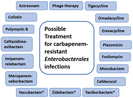 Possible therapeutic options for treatment of infection by CRE. * Represents the antibiotics that are currently under development processes or under clinical trials.