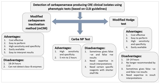 This is among the most typical and first-line methods for detecting carbapenemases. Several indicators could be utilised for this, but ertapenem is generally considered the most sensitive. MIC breakpoints are also used to confirm the sensitivity tests. These testing methods show high variability in detecting carbapenem resistance. The breakpoints suggested by the European Committee on Antimicrobial Susceptibility Testing (EUCAST) are helpful in predicting carbapenemase-resistant Gram-negative bacteria, but by this method, some bacteria remain susceptible to many carbapenems. For instance, some Enterobacterales isolates carry the antibiotic resistance gene blaKPC but can be acted upon by ertapenem, meropenem, and imipenem [,,]. The Clinical and Laboratory Standards Institute (CLSI) has formulated recommendations and guidelines for detecting CREs based on MIC breakpoints []. KPC is much more sensitive to this method as compared to NDM and IMP. As per CLSI, the carbapenemase-producing organisms should be resistant to all third-generation cephalosporins, but some CRE-producing OXA-48 are sensitive to third-generation cephalosporins []. The CLSI also suggested that when Enterobacterales isolates are suspected to be producing carbapenemase by carbapenem breakpoints, they should be further confirmed by molecular techniques and others such as MHT and the Carba NP test []. Although these are the first line of detection techniques for carbapenemase-producing organisms, they too fail to detect most of carbapenemase-producing microorganisms []. The advantages and disadvantages of certain phenotypic tests for the detection of carbapenemase producing CRE clinical isolates are shown in Figure 4.