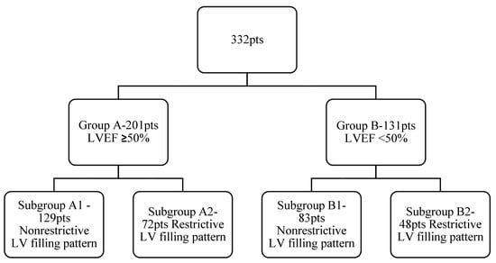 Selected patients were divided in two main groups, depending on their LV systolic dysfunction: Group A included 201 patients with normal LV systolic performance with an LVEF ≥ 50% and the second group, Group B, included 131 patients with LV systolic dysfunction with an LVEF < 50%. Taking into consideration the LV diastolic function, we subsequently divided each group into two: Group A was divided into Subgroup A1, with 129 patients with a nonrestrictive diastolic filling pattern (normal diastolic filling, mild or moderate diastolic dysfunction), and Subgroup A2, comprising 72 patients with a restrictive diastolic filling pattern (severe diastolic dysfunction). Similarly, patients from Group B were divided into Subgroup B1, comprising 83 patients with a nonrestrictive diastolic filling pattern, and Subgroup B2, comprising 48 patients with a restrictive diastolic pattern (Figure 1).