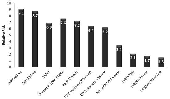 - A severely dilated LV with an LVES diameter > 58 mm and LVES volume > 200 mL/m2 (RR = 6.2–6.4, p value = 0.067).