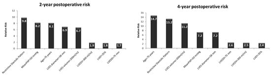 At 2 years postoperatively, the relative risk of death associated with the parameters known to increase the mortality rates in patients undergoing AVR (such as an increased LVES diameter, age, and LV systolic performance []) were higher in patients with severe LV diastolic dysfunction with a restrictive LVDFP (Figure 2).
