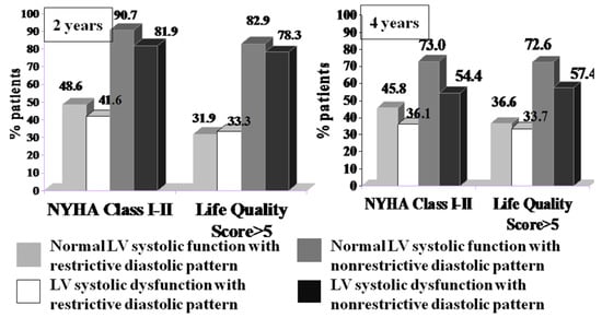 From a clinical point of view, patients with mild symptoms (NYHA class I or II and a life quality score > 5) were twice as likely to be in the group with nonrestrictive diastolic dysfunction, regardless of their LV systolic performance at both the 2- and 4-year follow-ups (Figure 5).