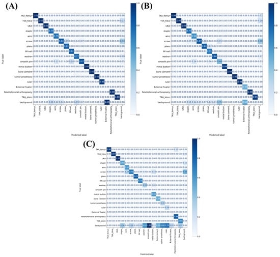 Confusion matrices on validation set (A), internal test set (B), and external test set (C). Among 18 labels on each axis, only ‘background’ is not an object class. If the ‘True label’ is background and the ‘Predicted label’ belongs to one of the object classes, it means that the model made a false positive judgment on the presence of an implant. If the ‘Predicted label’ is background and the ‘True label’ belongs to one of the object classes, it means that the model made a false negative judgment on the presence of an implant.