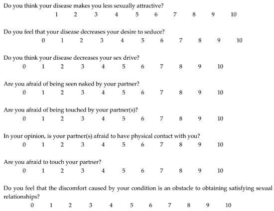 Moreover, we used a second questionnaire (Figure 1), an unvalidated instrument created specifically for this study, to obtain the assessment of the influence of AD on the body image, sexuality, and self-perception of those affected. An 8-item questionnaire using a 0–10 scale (0–3 = no effect at all on patient’s SH, 3–6 = moderate effect on patient’s sexual health, 7–10 = severe effect on patient’s sexual health) was administered to all patients enrolled. Patients completed their questionnaire anonymously after the medical examination such that their answers could not be influenced by the physicians in any way. Dupilumab was administered at the baseline dose (600 mg as starting dose, followed by 300 mg every 2 weeks). This study was approved by the local ethical committee.
