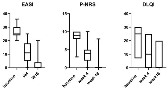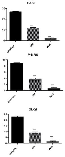 Likewise, we observed a significant improvement in both mean P-NRS and DLQI from baseline at all timepoints (p < 0.0001) (Figure 2). The respective mean percentage reduction from baseline to W4 and W16 was 57.76% and 90.55% for P-NRS, and 60.52% and 76.75% for the DLQI score (Table 1).
