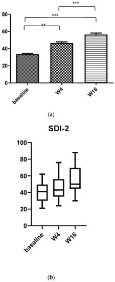(a) Mean variation in SDI-2 from baseline to week 4 and week 16 during dupilumab treatment. (b) Box plot for SDI-2 relative variations from baseline to week 4 and 16 in adult patients treated with dupilumab. (b) Mean values of Sexual Desire Inventory-2 (SDI-2) of study population at baseline and after 4 weeks (W4) and W16 of dupilumab treatment. Statistical significance was assessed by the Mann–Whitney test and Fisher test: *** p < 0.0001, ** p < 0.001,.