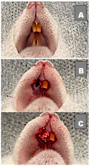 After a 6-hour fasting, all animals were submitted to surgery under general anesthesia through intraperitoneal access—conforming to the Federal Fluminense University’s experimental animal laboratory (LEA) protocol—with injection of 0.6 mL anesthetic solution, which was prepared with 1.0 mL of ketamine 10% (Dopalen®—100 mg/mL; CEVA laboratory—Paulínia-São Paulo-Brazil), 0.5 mL of xylazine 2% (Anasedan®—20 mg/mL; CEVA laboratory—Paulínia-São Paulo-Brazil) and 8.5 mL of sterile 0.9% saline solution (KabiPac®—Fresenius Kabi-Barueri-São Paulo-Brazil). After anesthesia, a syndesmotomy, luxation and extraction of the maxillary right central incisors was performed using a millimetric probe number 5 (Duflex®—Juiz de Fora-Minas Gerais-Brazil), as shown in Figure 1A,B. Afterwards, animals were divided into 3 groups: the first group was filled with 0.06 g of biomaterial microspheres that were embedded in 0.6 mL of melatonin gel for 60 minutes to hydrate the material; the second group was filled with 0.06 g of biomaterial microspheres embedded in 0.6 mL of placebo gel; and the third group did not receive any fillings (blood clot) (Figure 1). Finally, a closure using nylon suture 5-0 (Ethicon®—Johnson & Johnson-São Paulo-São Paulo-Brazil) was performed, and an antiseptic was given through gauze embedded in chlorhexidine solution to protect the surgical wound and prevent a secondary infection.