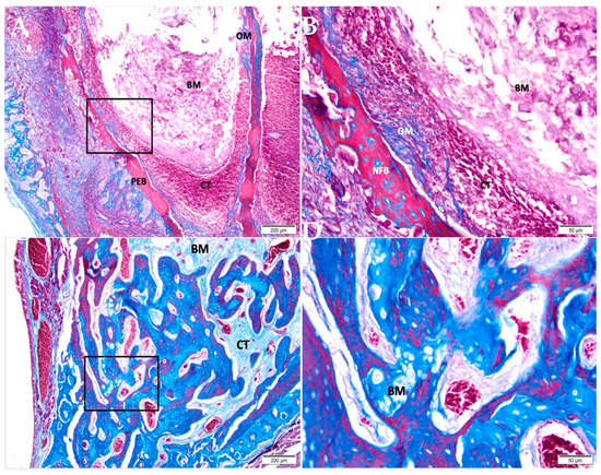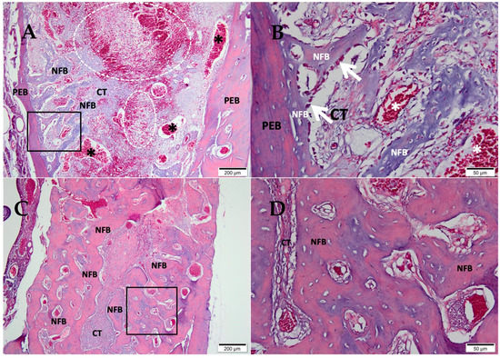 Photomicrographs of the CHA group 7 and 42 days after alveolar grafting. (A,B) 07 days; (C,D) 42 days; (A,C) 10× magnification (Bar: 200 μm); (B,D) 40× magnification (Bar: 50 μm); Stain: Masson’ trichrome. Biomaterial (BM); Connective Tissue (CT); Pre-Existing Bone (PEB); Newly Formed Bone (NFB).