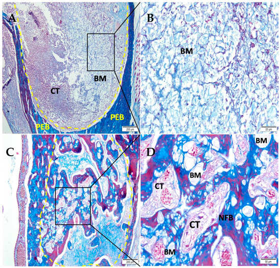 Photomicrographs of the CHA-M group 7 and 42 days after alveolar grafting. (A,B) 07 days; (C,D) 42 days; (A,C) 10× magnification of (Bar: 200 μm); (B,D) 40× magnification (Bar: 50 µm); Stain: Masson’ trichrome. Biomaterial (BM); Connective Tissue (CT); Newly Formed Bone (NFB), and Pre-Existing Bone (PEB).