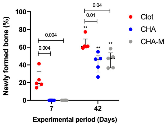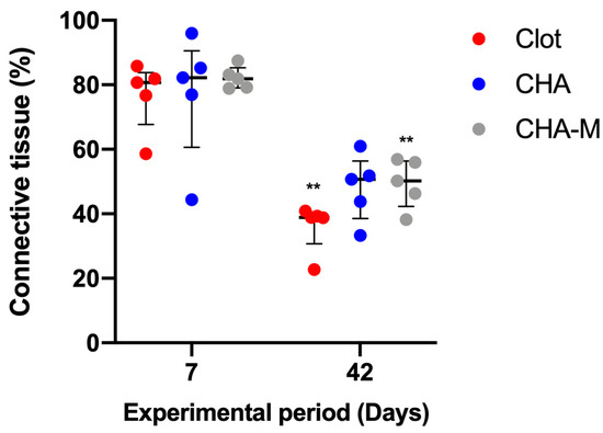 A decline in connective tissue’s volume was observed in the clot and CHA-M groups 42 days after surgery, compared to the previous experimental group (p = 0.007). In experimental periods, there were no observed differences between groups (Figure 7).