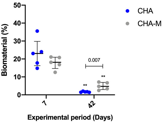 Percentage of biomaterial of CHA and CHA m groups after 7 and 42 days after grafting. Results are presented as a median and IQR (n = 5). Kruskal–Wallis and Dunn’s post-test were applied to investigate differences between the groups at the same time point. Mann–Whitney test was used to evaluate differences between groups and time points. The ** p = 0.007 represents statistical difference between the same group in different experimental periods. The horizontal bar represents statistical differences between groups over the same period.