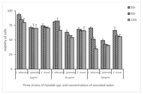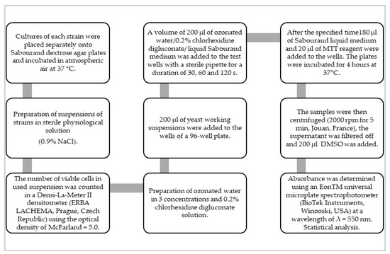 Kuśka-Kiełbratowska, A.; Wiench, R.; Mertas, A.; Bobela, E.; Kiełbratowski, M.; Lukomska-Szymanska, M.; Tanasiewicz, M.; Skaba, D. Evaluation of the Sensitivity of Selected Candida Strains to Ozonated Water—An In Vitro Study. Medicina 2022, 58, 1731. https://doi.org/10.3390/medicina58121731