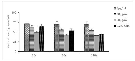 - Soares, I.H.; Loreto, S.; Rossato, L.; Mario, D.N.; Venturini, T.P.; Baldissera, F.; Santurio, J.M.; Alves, S.H. In vitro activity of essential oils extracted from condiments against fluconazole-resistant and -sensitive Candida glabrata. J. Mycol. Med. 2015, 25, 213–217. [Google Scholar] [CrossRef]