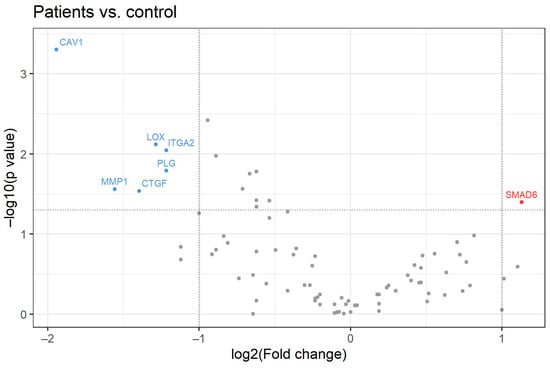 According to the manufacturer’s instructions, peripheral blood samples from patients and controls were collected in PAXgene RNA tubes (Pre-AnalytiX, Hombrechtikon, Switzerland) and RNA was isolated using the PAXgene RNA Kit (Pre-AnalytiX, Hombrechtikon, Switzerland). The quality and concentration of isolated RNA were tested using a BioPhotometer pPlus spectrophotometer (Eppendorf, Hamburg, Germany) by measuring the absorbance at wavelengths of 230 nm, 260 nm and 280 nm. cDNA was synthesized using the QIAGEN RT2 First Strand Kit (QIAGEN, Hilden, Germany) following the manufacturer’s instructions and added to the RT2 SYBR Green qPCR Master Mix (QIAGEN, Hilden, Germany). The samples were added to the 96-well plate of RT 2 Profiler TM PCR Array Human Fibrosis (QIAGEN, Hilden, Germany). The expression of 84 genes involved in the immune response and the pathogenesis of fibrosis was determined using real-time quantitative RT-PCR. PCR reactions were carried out by using ABI 7500 Fast (Applied Biosystems, Foster City, CA, USA) under the following conditions: 10 min on 95 C, 40 cycles for 15 s on 95 C and 1 min on 60 C. Calculations and analysis of Ct values and melting curves for all PCR reactions were performed using 7500 System SDS Software v1.4.0 (Applied Biosystems, Foster City, CA, USA). The PCR array contained a panel of 96 primer sets. A total of 84 sets were specific for fibrosis genes, 5 for housekeeping genes, 1 for genomic DNA control, 3 for reverse transcription controls and 3 for positive PCR controls. The array facilitated the analysis of the following genes: pro-fibrotic genes (AGT, CCL-11 (Eotaxin) and ACTA-2 (α-SMA)), CCL-2 (MCP-1), CCN-2 (CTGF), CCL-3 (MIP-1A), GREM-1, IL-13, IL-5, IL-13RA-2, IL-4, SNAI-1 (SNAIL); anti-fibrotic genes (IFNG, IL-10, BMP-7, HGF and IL-13RA-2); extracellular matrix (ECM) and cell adhesion molecules, extracellular matrix (ECM) structural constituents (COL-1A2 and COL-3A1); extracellular matrix (ECM) remodeling enzymes (LOX, MMP-1, MMP-2, MMP-3, MMP-13, MMP-14, MMP-8, MMP-9, PLG, PLAT (TPA), PLAU (UPA), SERPINH-1 (HSP47), SERPINA-1, SERPINE-1 (PAI-1), TIMP-4, TIMP-3, TIMP-2 and TIMP-1); cell adhesion molecules (ITGA-3, ITGA-2, ITGA-1, ITGAV, ITGB-3, ITGB-1, ITGB-6, ITGB-8 and ITGB-5), inflammatory cytokines and chemokines (CCL-11 (Eotaxin), CCL-3 (MIP-1A), IL-5, CCL-2 (MCP-1), TNF, CCR-2, IL-13, CXCR-4, IFNG, IL-1A, IL-10, IL13-RA-2, IL-1B, IL-4 and ILK); growth factors (EDN-1, AGT, EGF, CCN-2, HGF, PDGFB, PDGFA, VEGFA); signal transduction TGF-ß superfamily members (CAV-1, BMP-7, GREM-1, DCN, LTBP-1, ENG (EVI-1), INHBE, SMAD-7, SMAD-2 (MADH2), SMAD-3 (MADH3), SMAD-4 (MADH4), SMAD-6, THBS-1 (TSP-1), THBS-2, TGFB-3, TGFB-2, TGFB-1, TGFBR-1 (ALK5), TGFBR-2 and TGIF-1); transcription factors (JUN, CEBPB, MYC, SP-1, STAT-1, NFKB-1 and STAT-6); epithelial to mesenchymal transition (EMT) (COL-1A2, AKT-1, ILK, BMP-7, COL-3A1, ITGAV, ITGB-1, MMP-3, MMP-9, MMP-2, SERPINE-1(PAI-2), SMAD-2 (MADH2), SNAI (SNAIL), TGFB-3, TGFB-1, TGFB-2 and TIMP-1); and other fibrosis genes (FASLG (TNFSF6) and BCL-2,). Data analysis was performed using RT2 Profiler PCR Array Data Analysis v3.5 (QIAGEN, Hilden, Germany). Toidentify and visualize significant changes in gene expression. a volcano plot was created.