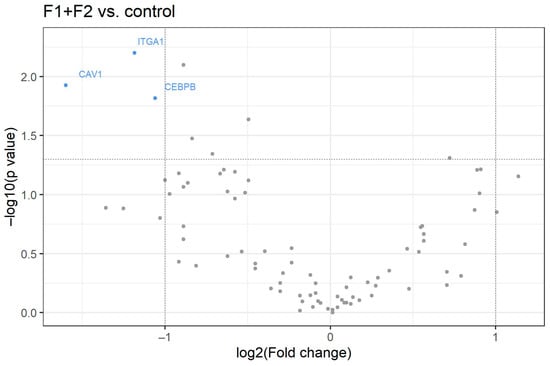 Volcano plot for 84 analyzed genes. The X-axis shows the log2 value of the fold change between patients with F1 and F2 stages of chronic hepatitis C compared to healthy controls without HCV. The Y-axis represents −log10 p-value. Red points symbolize overexpressed genes and blue points represent underexpressed genes. Horizontal line shows threshold where p = 0.05.