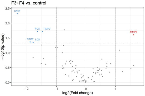 Volcano plot for 84 analyzed genes. The X-axis shows the log2 value of the fold change between patients with F3 and F4 stages of chronic hepatitis C compared to the healthy controls without HCV. The Y-axis represents −log10 p-value. Red points symbolize overexpressed genes and blue points represent underexpressed genes. Horizontal line shows threshold where p = 0.05.