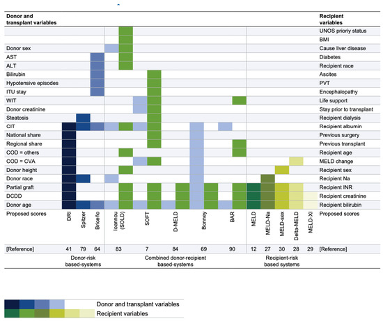Different D–R matching systems based on donor and recipient variables. COD, cause of death; CVA, cardiovascular accident; DCDD, donation after circulatory determination of death; PVT, portal vein thrombosis. Figure obtained from Briceno J, Ciria R, de la Mata M. Donor–recipient matching: myths and realities. J. Hepatol. 2013, 58 (4), 811–820. Copyright © 2022 European Association for the Study of the Liver. Published by Elsevier Ireland Ltd. All rights reserved.