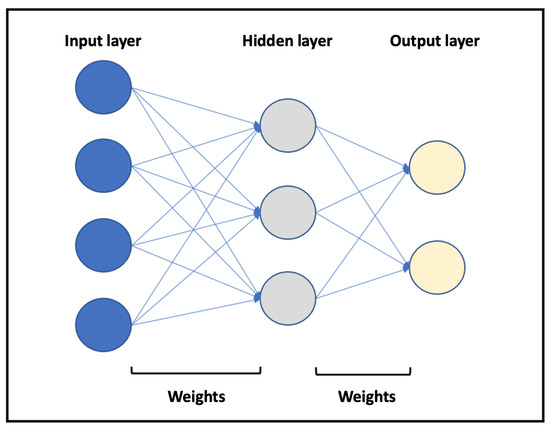 Representation of a basic neural network. Different layers are represented in blue (input layer), gray (hidden layer), and yellow (output layer). The arrows represent the relationships between neurons (weights).