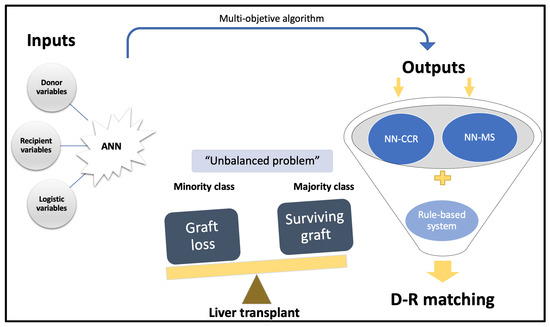 Diagram of an ANN-based on a multi-objective algorithm. Liver transplantation outcomes are shown as an unbalanced problem, and we classify them into the majority class (probability of surviving after liver transplantation, NN-CCR) and the minority class (probability of not surviving, NN-MS). By combining both probabilities (NN-CCR and NN-MS) based on input variables, we obtain a final D–R matching according to a rules-based system. ANN, artificial neural network; NN-CCR, neural network based on the correct classification rate or accuracy; NN-MS, neural network based on the minimum sensitivity.