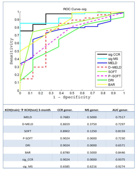 To externally validate this methodology, a second study [21] was performed with a dataset of 858 D–R pairs from liver transplants at King’s College Hospital (KCH) in London. The authors found that the models obtained with this database achieved excellent results at 3 months [CCR-AUC 0.94; MS-AUC 0.94] and 12 months (CCR-AUC 0.78; MS-AUC 0.82). When these results were compared with other scores, such as MELD and BAR (Figure 4), a 15% difference was found in favor of the proposed model. The main reason for these findings was that a homogenous database with a low number of missing values was used. In addition to the differences in the input variables and the population, this would justify the differences between the KCH database and the Spanish model. Therefore, the authors concluded that each ANN should be used in the specific population in which it was trained.
