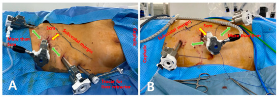 Under general anesthesia, the patient was placed in the lateral decubitus position. The patient’s bed was bent at an angle of 80° to expose the side as much as possible. Figure 1 shows the trocar placement in RA. For the right side, three robotic arms and an additional 5 mm port were required for liver mobilization, as shown in Figure 1A. For the left side, only three robotic arms were needed, as shown in Figure 1B. For effective movement of the robotic endowrist in the abdominal cavity, robot trocars were placed 3 cm apart from the subcostal margin to enable the unrestricted movement of the robotic arms. To prevent collision of the robot arms, a distance of approximately 5 cm was maintained between the trocars. We used three types of robotic endowrist instruments: prograsp forceps, long bipolar, and vessel sealer extend.