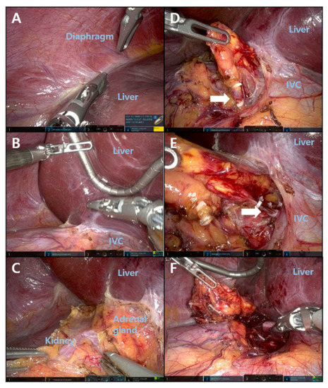 Procedure for robotic right adrenalectomy. (A) Liver mobilization. (B) Liver retraction and inferior vena cava identification. (C) Gerota’s fascia dissection and adrenal gland identification. (D) Adrenal vein identification. (E). Clipping of the adrenal vein. (F) Adrenalectomy completion.
