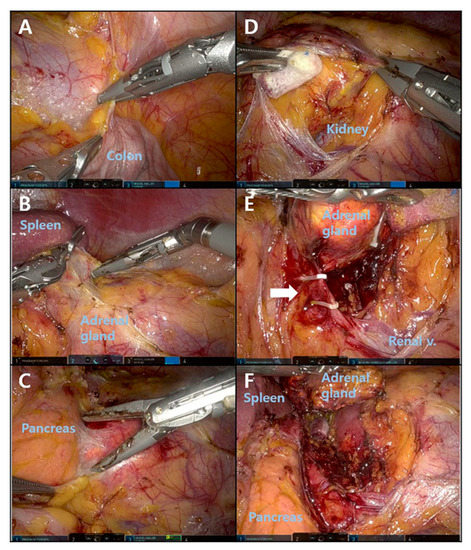 The steps for left RA are shown in Figure 3. The left colon was lowered by dissecting around the splenic flexure (Figure 3A). Then, the spleen was pulled downward by dissecting the splenocolic and splenophrenic ligaments (Figure 3B). After dissection around the distal pancreas and Gerota’s fascia, the location of the adrenal gland was revealed (Figure 3C). The superior pole of the left kidney was exposed, and careful dissection was performed around the adrenal gland (Figure 3D). After identifying the adrenal vein, it was ligated by hem-o-lock and cut (Figure 3E). The remaining soft tissue around the adrenal gland was detached, and the adrenalectomy was completed (Figure 3F).