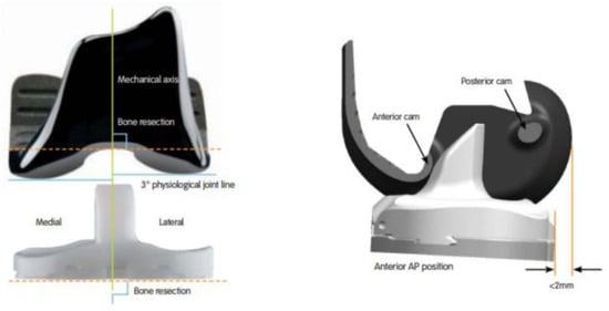 The JOURNEYTM II Bi-cruciate Stabilized Total Knee System (Smith & Nephew, Memphis, TN, USA) has an asymmetric femoral component, a polyethylene insert replicating 3° of the tibial varus, a medially concave and laterally convex shape, and a dual cam-post mechanism.