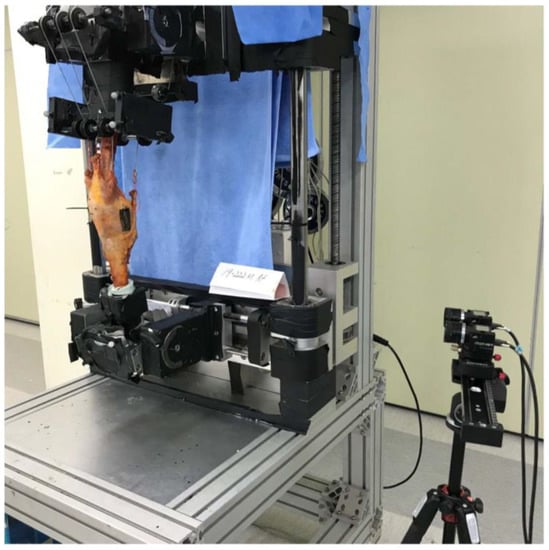 Experimental setup for biomechanical testing. A high-resolution digital camera was installed 1 m from the specimen, which was mounted onto a customized knee squatting simulator system.