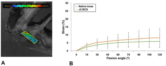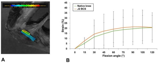 Area for mean MCL strain measurements (A) and comparisons of mean MCL strain between native and BCS TKA knees (B). The mean strain after BCS TKA was similar to the mean strain in native knees at all flexion angles. Error bars indicate standard deviations. The correspondence between color and strain is shown in the color bar.