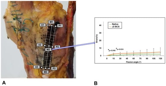 Data are presented as means ± standard deviations. Paired t-tests were used to determine whether the mean and peak MCL strains differed between native and post-TKA knee specimens. The Shapiro–Wilk test confirmed that this data set was normally distributed. The variables subjected to multiple between-group comparisons included the mean, peak, and distribution of MCL strain, which were analyzed using repeated-measures ANOVA, followed by the Bonferroni corrected post hoc test in order to protect against multiple comparison bias. In addition, paired t-tests were used to determine differences in the distribution of MCL strain at 9 ROIs between native and BCS TKA knee specimens. Data analysis was performed using SPSS software for Windows (ver. 26.0; IBM Corp., Armonk, NY, USA). p < 0.05 was considered to indicate statistical significance. A priori power analysis based on the results of our previous study of changes in the MCL strain in native knees was performed to determine the necessary sample size to achieve sufficient statistical power. Using a two-sided hypothesis test at an alpha level of 0.05 and power of 80%, 7 knees were required to detect a 5% difference. A 5% change was considered biomechanically meaningful since ligament damage occurs at 5% strain [].