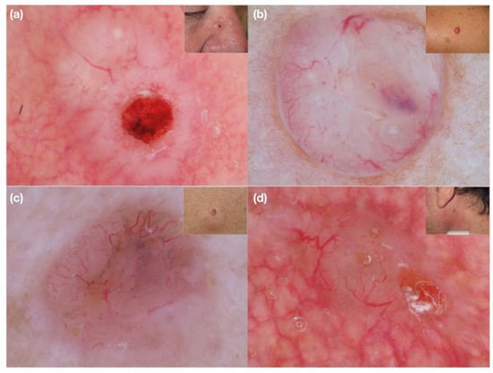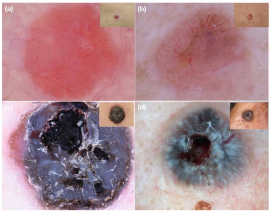 - Zalaudek, I.; Kreusch, J.; Giacomel, J.; Ferrara, G.; Catricalà, C.; Argenziano, G. How to diagnose nonpigmented skin tumors: A review of vascular structures seen with dermoscopy: Part I. Melanocytic skin tumors. J. Am. Acad. Dermatol. 2010, 63, 361–374. [Google Scholar] [CrossRef] [PubMed]