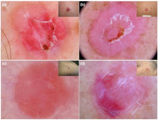 A similar situation can be observed confronting nodular poorly differentiated squamous cell carcinoma (SCC) with keratoachantoma, that are typically raised non pigmented skin lesions. Hairpin-like vessels occur more frequently in well differentiated SCC (such as keratoacanthoma) []. They usually appear elongated and thicker, distributed around the periphery of the lesion. Vessels in invasive SCC are typically polymorphic/non-homogenous with small caliber [].