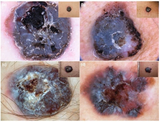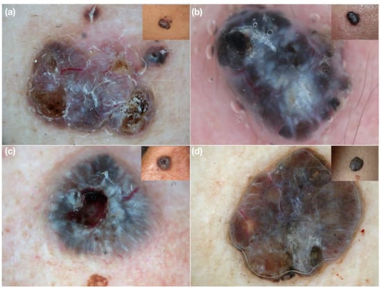 - Argenziano, G.; Longo, C.; Cameron, A.; Cavicchini, S.; Gourhant, J.Y.; Lallas, A.; McColl, I.; Rosendahl, C.; Thomas, L.; Tiodorovic-Zivkovic, D.; et al. Blue-black rule: A simple dermoscopic clue to recognize pigmented nodular melanoma. Br. J. Dermatol. 2011, 165, 1251–1255. [Google Scholar] [CrossRef] [PubMed]