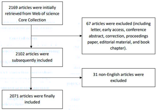 A total of 2071 articles were part of the bibliometric analysis via CiteSpace 6.1.R2 (64-bit) Basic (Chao-Mei Chen, USA), VOSviewer_1.6.18 (Nees Jan van Eck and Ludo Waltman, Leiden, The Netherlands), and Microsoft Office Excel 2019 (Microsoft Corporation, Washington, USA). CiteSpace, which was developed by Chao-Mei Chen, is a Java-based visualization tool for bibliometrics and data visualization [47]. In this study, CiteSpace was applied to perform literature co-citation analysis, generate knowledge maps of the SB-CVD research area, and find citation bursts of co-cited references and keywords. The co-cited reference is defined as a document being cited by two articles [48], while the analysis of co-citation references is one of the essential metrics of bibliometrics. The visual knowledge map represents the keywords and references with citation bursts, while the occurrence of citation bursts describes the strength of a certain theme frequency. Citation bursts can indicate the intensity and frequency of keywords and references over a period of time to reveal the hotspots and frontiers within a research area [47]. VOSviewer is another visualization tool that was developed by Leiden University [49,50]. Taking into account the advantages of VOSviewer in generating intuitive figures and processing big data [49], it was performed to conduct the distribution and cooperation map analysis of countries/regions, institutions, and authors, as well as the analysis of keyword co-occurrence. The total link strength (TLS) and the sum of times cited (SoTC) were automatically calculated by VOSviewer, while the average citations per item (ACI) were obtained by dividing SoTC by the quantity of published articles. The TLS indicates the number of publications in which two keywords occur together. Excel was utilized to analyze the distribution of annual publications and citations and their changing trends. In previous studies, cubic polynomial functions have been successfully applied to predict publication trends [51,52]. Accordingly, the function model was set as: y = ax3 + bx2 + cx + d, while y represents the cumulative amounts of publications and x represents the year of publication. Furthermore, Excel was used in this study to analyze the proportion of article types, the distribution of funding agencies, and disciplines based on the data automatically generated from WoSCC.