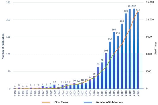 A total of 2071 publications were included in the final analysis, including 1802 articles and 269 reviews. In the SB-CVD research area, the major publication types were articles, accounting for 87.01%. The annual publications and citations in the SB-CVD research area, which is one of the main indicators to illustrate the development trends in a research area [53], were presented in Figure 2. The years 2000 and 2011 were two milestone years for the SB-CVD research area, with annual publication volumes topping 10 and 50 for the first time, respectively, with publication then peaking in terms of annual volume in the year 2020 (232 publications). Based on data from annual publications 1990–2021, the formula for the trend of annual publication in the SB-CVD research area was obtained by fitting the curve as: y= −0.0135x3 + 81.394x2 − 163931x + 1E + 08 (R2 = 0.8117). The formula predicted that 187 papers would be published in the whole year 2022, while as of 30 June 2022, 74 documents have been published. With the gradual systematization of the SB-CVD research area, and the attention of the general public and academia to the health care field evoked by the COVID-19 pandemic, the SB-CVD research area will present a sustained upward trend.