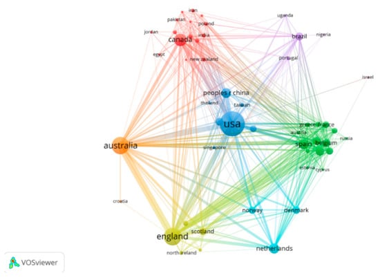 As presented in Table 1, the largest number of publications in the SB-CVD research area were from the USA, England, and Australia. Publications from these three countries accounted for more than 70% of the total number of publications, indicating that these three countries had a high interest in the SB-CVD research area. Sweden (87.47) and Belgium (78.70) had the highest ACI, indicating the early development of the SB-CVD research area and the high quality of the research in these two countries. Figure 3 shows the cooperation between countries; the USA frequently cooperated with England, Australia, and Canada; England primarily collaborated with Australia, the USA, and Belgium; and Australia predominantly cooperated with England, the USA, and Belgium.