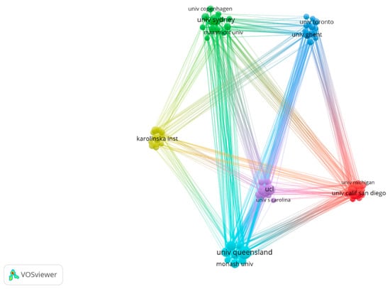 The University of Queensland published the largest number of documents in the SB-CVD research area, followed by the University of Sydney and University College London (see Table 2). Only two institutions had an ACI greater than 100; Baker IDI Heart & Diabetes Institute had the highest ACI (175.96), followed by the University of Queensland (126.89). Of the top ten active institutions, six were from Australia, two from the USA, and one each from England and Sweden. Figure 4 presented inter-institutional collaboration in the SB-CVD research area. The University of Queensland frequently cooperated with Baker IDI Heart & Diabetes Institute, Monash University, Deakin University, the University of Sydney, University College London, and Vrije University Amsterdam; and University College London mainly collaborated with the University of Bristol, Harvard Medical School, and the University of Queensland.