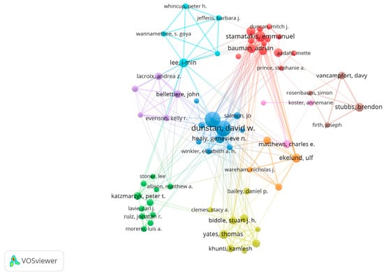 Dunstan D and Owen N from Baker IDI Heart & Diabetes Institute contributed to the largest number of publications, followed by Stamatakis E from the University of Sydney (see Table 3). Five of the top ten authors were from Australia, three from England, and one each from the USA and Norway. The collaborative network between the authors was shown in Figure 5, with Dunstan D frequently collaborating with Owen N, Healy G, Winkler E, Salmon J, and Dempsey P; and Stamatakis E mainly cooperated with Hamer M, Bauman A, and Ding D.